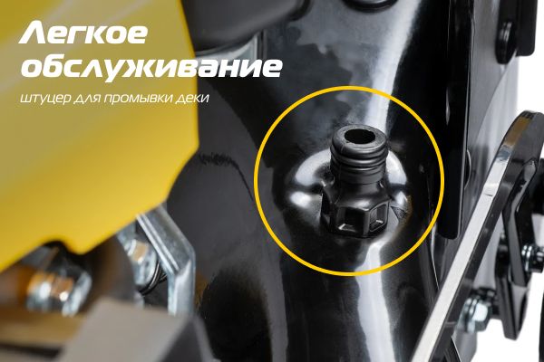 Легкая очистка деки: достаточно подключить садовый шланг к быстросъемному коннектору штуцера и запустить двигатель. Вода под давлением попадает внутрь, а вращающийся нож создает турбулентный поток, который мгновенно смывает все остатки травы.