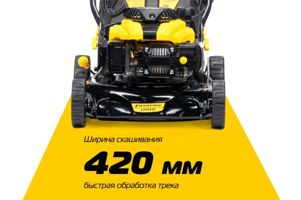 Имеет ширину скашивания 420 мм, что оптимально для дачного участка небольшой площади в 5-6 соток.