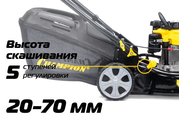 Высота скашивания удобно регулируется одним рычагом. Предусмотрено 5 положений высоты, что позволяет выбрать оптимальную высоту травы в зависимости от назначения газона.