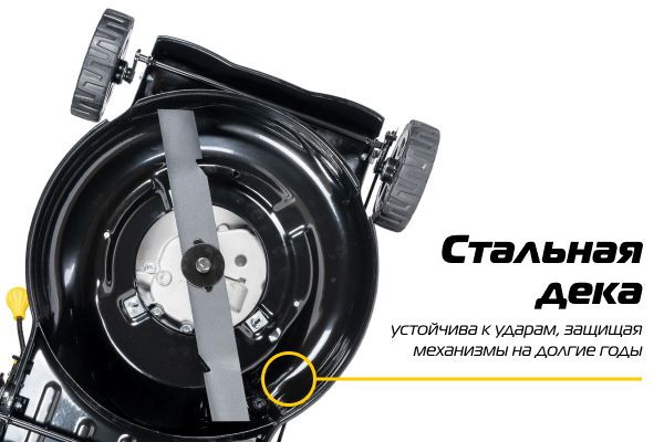 Самоходный привод на колеса обеспечивает движение газонокосилки, исключая необходимость ручного толкания и тем самым снижая нагрузку на оператора и повышая производительность.