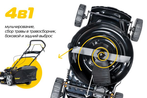 4 режима работы в 1 газонокосилке (травосборник, боковой и задний выброс, мульчирование) позволяет по-разному использовать ее в зависимости от предстоящих задач.