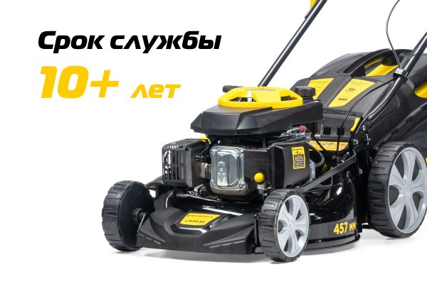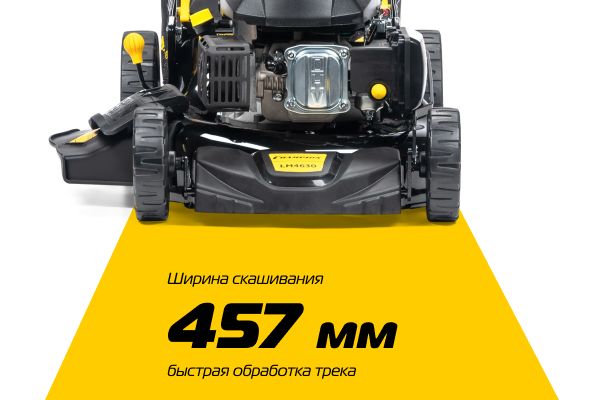 Имеет ширину скашивания 457 мм, что оптимально для дачного участка небольшой площади в 5-6 соток.