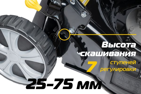 Центральная регулировка высоты среза позволяет настроить необходимую высоту скашивания одним движением. В данной модели предусмотрено 7 ступеней высоты в зависимости от назначения газона