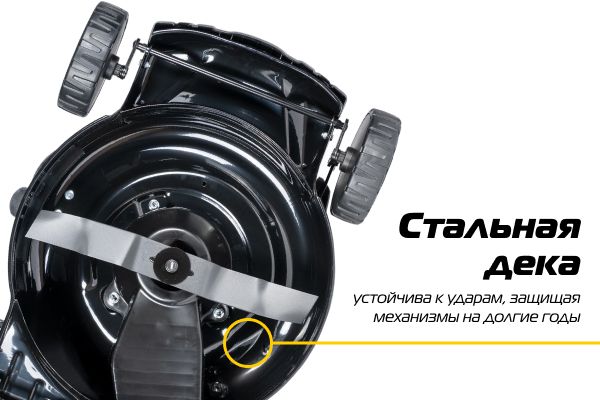 Стальная дека обеспечивает жесткость и ударопрочность конструкции, что продлевает Срок службы газонокосилки в разы