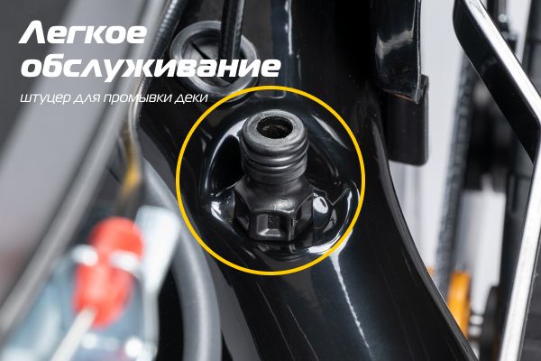 Легкая очистка деки: достаточно подключить садовый шланг к быстросъемному коннектору штуцера и запустить двигатель. Вода под давлением попадает внутрь, а вращающийся нож создает турбулентный поток, который мгновенно смывает все остатки травы.