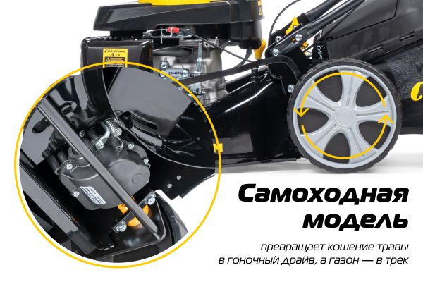 Самоходный привод на колёса перемещает косилку самостоятельно, поэтому оператору не требуется прилагать усилий для её толкания, что экономит его силы и ускоряет процесс кошения.