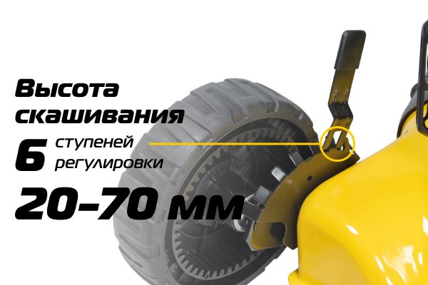 Регулировка высоты среза позволяет настроить необходимую высоту скашивания одним движением. В данной модели предусмотрено 6 ступеней высоты в зависимости от назначения газона.