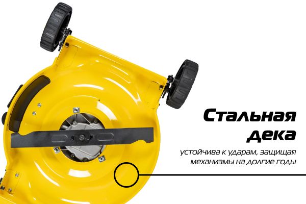 Стальная дека обеспечивает жесткость и ударопрочность конструкции, что продлевает Срок службы газонокосилки в разы.