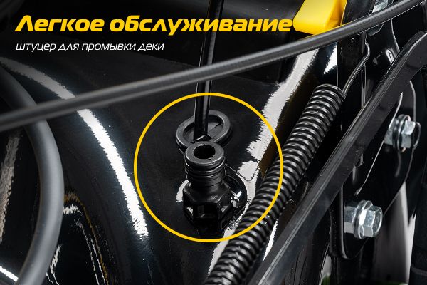 Легкая очистка деки: достаточно подключить садовый шланг к быстросъемному коннектору штуцера и запустить двигатель. Вода под давлением попадает внутрь, а вращающийся нож создает турбулентный поток, который мгновенно смывает все остатки травы.