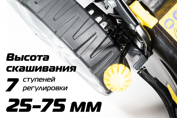Высота скашивания удобно настраивается рычагом на задней колесной оси. 7-ступенчатая регулировка позволяет выбрать оптимальную высоту травы в зависимости от назначения газона.