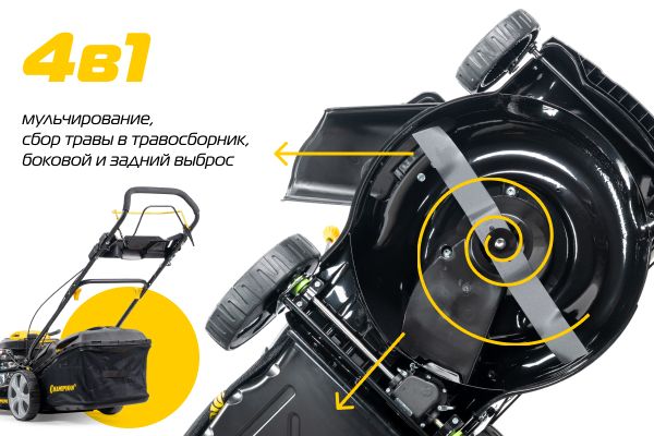 Есть функции мульчирования, бокового и заднего выбросов, а также вместительный травосборник.