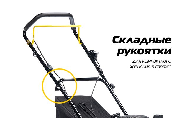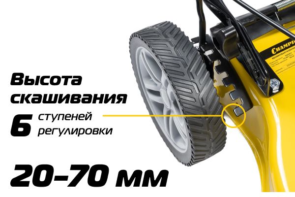 Высота скашивания удобно регулируется одним рычагом. Предусмотрено 6 положений высоты, что позволяет выбрать оптимальную высоту травы в зависимости от назначения газона.