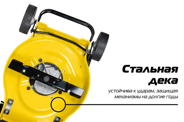 Самоходный привод на колеса обеспечивает движение газонокосилки, исключая необходимость ручного толкания и тем самым снижая нагрузку на оператора и повышая производительность.