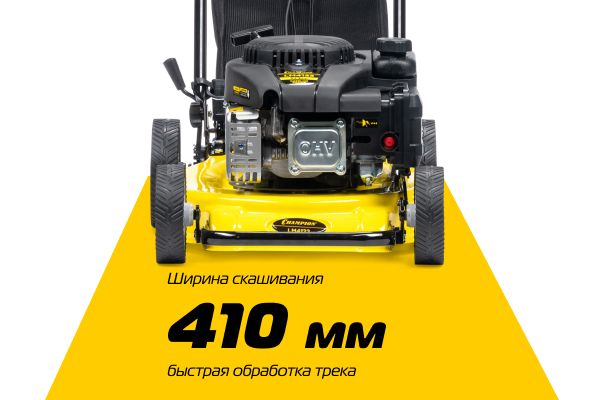 Имеет ширину скашивания 410 мм, что оптимально для дачного участка небольшой площади в 5-6 соток.