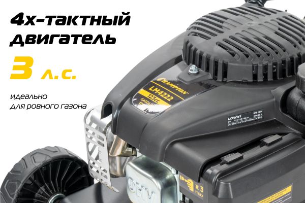 Газонокосилка с 4-х тактным двигателем мощностью 3 л.с. отлично подойдет для ухода за ровным газоном.