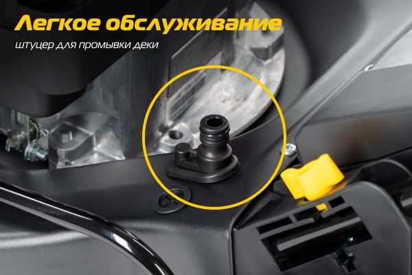 Легкая очистка деки: достаточно подключить садовый шланг к быстросъемному коннектору штуцера и запустить двигатель. Вода под давлением попадает внутрь, а вращающийся нож создает турбулентный поток, который мгновенно смывает все остатки травы.