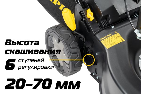Высота скашивания удобно регулируется при помощи специального рычага. Предусмотрено 6 положений от 20 до 70 мм, что позволяет выбрать нужную высоту стрижки газона.