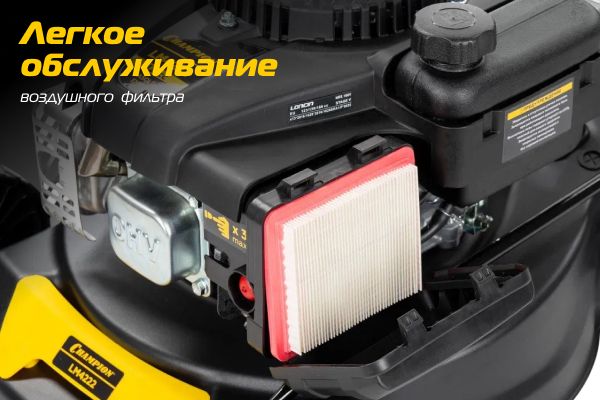 Воздушный фильтр Champion легко обслуживать: крышка снимается руками, без использования инструментов. При этом бумажный фильтр обеспечивает максимальную защиту двигателя от пыли и сохраняет мощность даже в сложных условиях.
