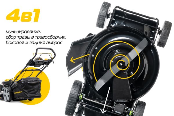 4 режима работы в 1 газонокосилке (травосборник, боковой и задний выброс, мульчирование) позволяет по-разному использовать ее в зависимости от предстоящих задач.