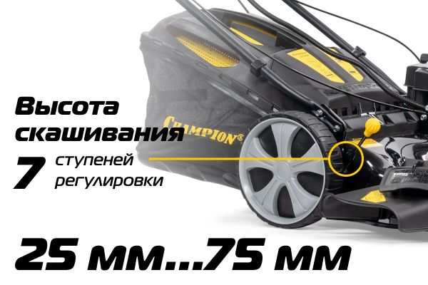 Центральная регулировка высоты среза позволяет настроить необходимую высоту скашивания одним движением. В данной модели предусмотрено 7 ступеней высоты в зависимости от назначения газона.