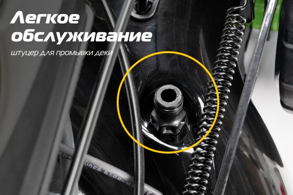 Легкая очистка деки: достаточно подключить садовый шланг к быстросъемному коннектору штуцера и запустить двигатель. Вода под давлением попадает внутрь, а вращающийся нож создает турбулентный поток, который мгновенно смывает все остатки травы.