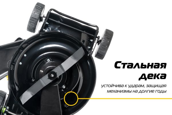 Стальная дека обеспечивает жесткость и ударопрочность конструкции, что продлевает Срок службы газонокосилки в разы.