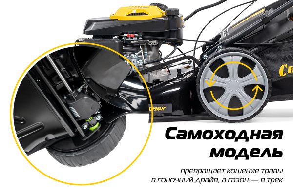 Самоходный привод на колёса перемещает косилку самостоятельно, поэтому оператору не требуется прилагать усилий для её толкания, что экономит его силы и ускоряет процесс кошения.