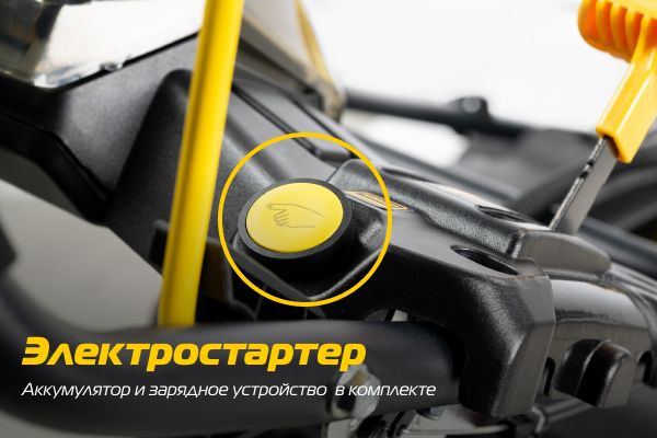 Помимо ручного запуска есть функция электростартера. Аккумулятор и зарядное устройство поставляются в комплекте.
