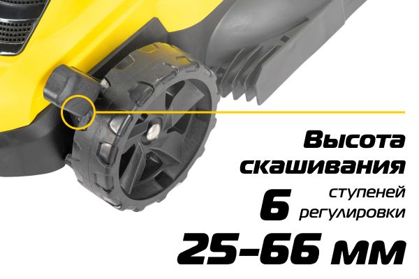 Регулировка высоты среза от 25 до 66 мм позволяет настроить нужную высоту скашивания в зависимости от назначения газона.