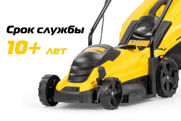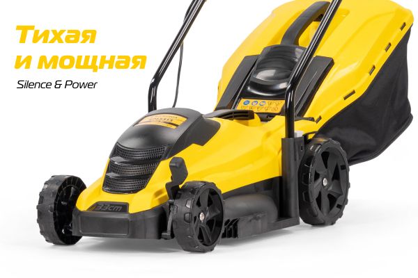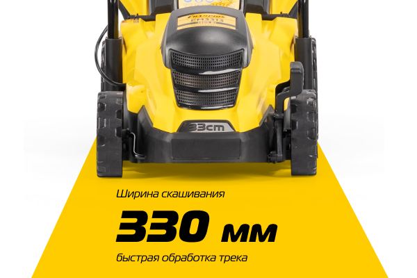 Имеет ширину скашивания 330 мм, что оптимально для дачного участка площадью 10 соток.