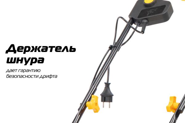 Держатель шнура на газонокосилках Champion фиксирует кабель во время работы, а при резком зацепе — освобождает его, чтобы вилка безопасно вышла из розетки, предотвращая повреждения и травмы.