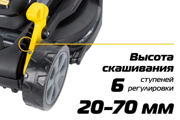 Центральная регулировка высоты среза позволяет настроить необходимую высоту скашивания одним движением. В данной модели предусмотрено 6 ступеней от 20 до 70 мм в зависимости от назначения газона.