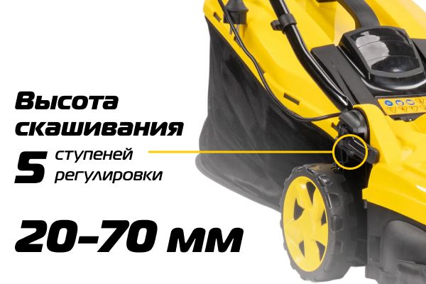 Центральная регулировка высоты среза позволяет настроить необходимую высоту скашивания одним движением. В данной модели предусмотрено 5 ступеней от 20 до 70 мм в зависимости от назначения газона.