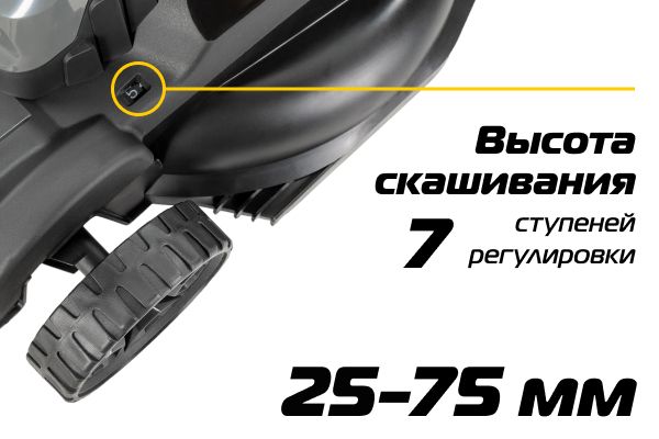 В данной модели предусмотрено 7 ступеней от 25 до 75 мм в зависимости от назначения газона.