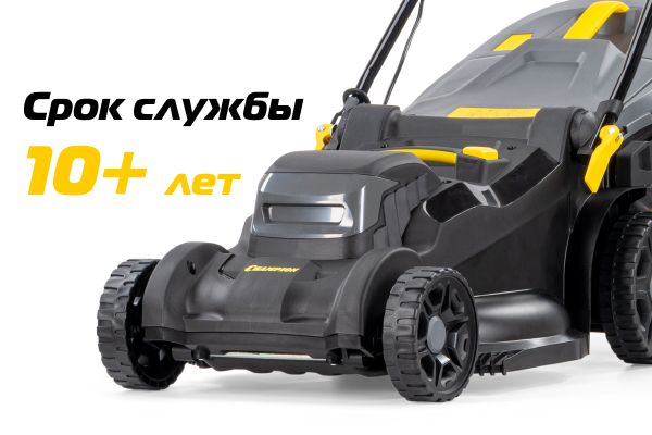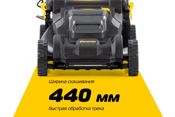 Имеет ширину скашивания 440 мм, что оптимально для дачного участка площадью 14 соток.