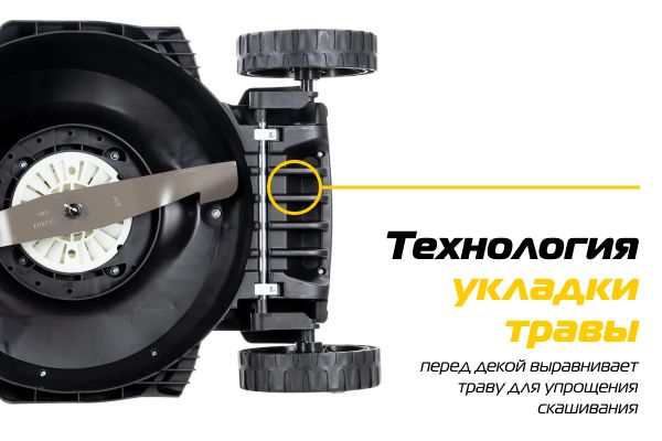 Перед декой есть специальная расческа, которая выравнивает и раскладывает траву для упрощения процесса скашивания.