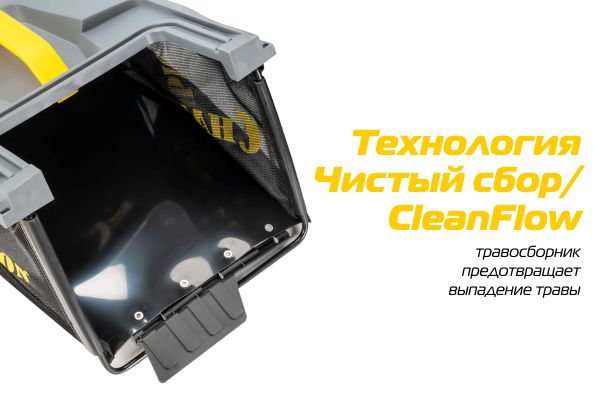 Вместительный травосборник объемом 40 литров позволяет реже прерывать работу для его очистки.