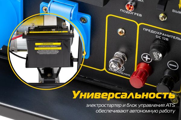 Электрический стартер позволяет без усилий запустить генератор. Блок управления ATS обеспечивает автономность работы и бесперебойное питание в сети.