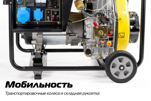 Транспортировочные колеса и складная рукоятка упрощают перемещение и хранение агрегата.