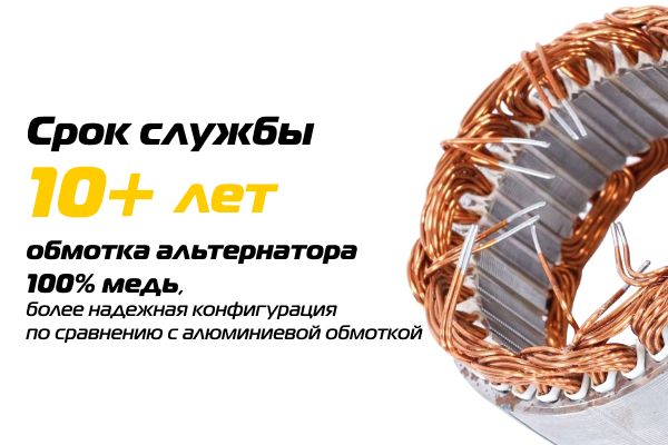 Благодаря применению медного провода (вместо алюминиевого) обеспечены низкое электросопротивление и высокая теплопроводность обмотки. Это исключает перегрев двигателя при пиковых нагрузках, предотвращает разрушение межвитковой изоляции и гарантирует заявленный срок службы генератора.