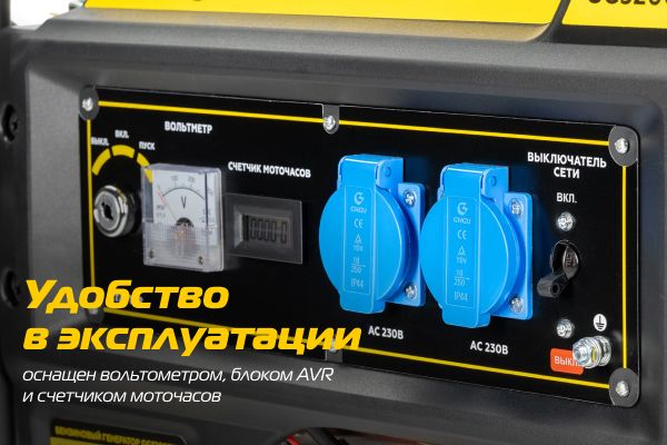 Счетчик моточасов позволяет определить состояние устройства и прогнозировать необходимость техобслуживания. Блок AVR автоматически стабилизирует напряжение и минимизирует колебания параметров тока. Вольтметр позволяет мониторить напряжение в цепи для предотвращения повреждений оборудования.