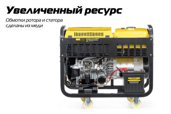 Благодаря применению медного провода (вместо алюминиевого) обеспечены низкое электросопротивление и высокая теплопроводность обмотки. Это исключает перегрев двигателя при пиковых нагрузках, предотвращает разрушение межвитковой изоляции и гарантирует заявленный срок службы генератора.