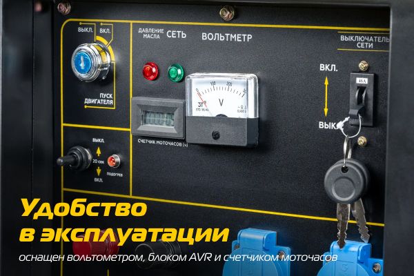 Счетчик моточасов позволяет определить состояние устройства и прогнозировать необходимость техобслуживания. Блок AVR автоматически стабилизирует напряжение и минимизирует колебания параметров тока. Вольтметр позволяет мониторить напряжение.