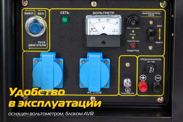 Блок AVR автоматически стабилизирует напряжение и минимизирует колебания параметров тока. Вольтметр позволяет мониторить напряжение в цепи для предотвращения повреждений оборудования.