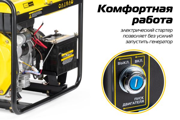 Генератор поставляется в состоянии полной заводской готовности: полностью собран и настроен, поэтому для начала работы достаточно залить топливо и масло — без какого-либо дополнительного монтажа или регулировок.