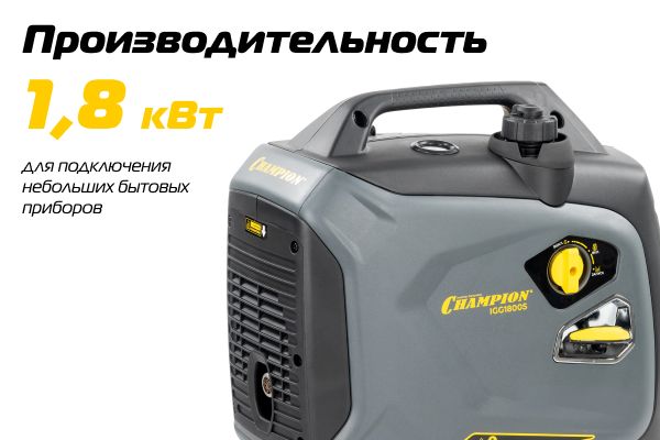 Инверторный генератор Champion IGG1800S рекомендован как резервный источник питания на даче и при решении небольших задач. За счет компактности, легкого веса и низкого уровня шума станет отличным решением при выездах на природу.