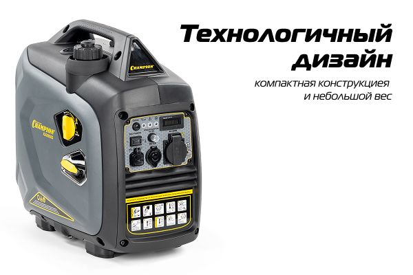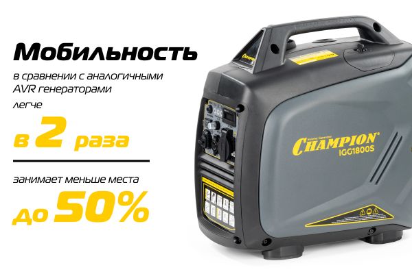 Инверторный генератор Champion отличается повышенной мобильностью и компактностью. Модель в два раза легче аналогичных AVR генераторов и занимает до 50% меньше места, что обеспечивает удобство транспортировки и хранения даже при ограниченном пространстве.