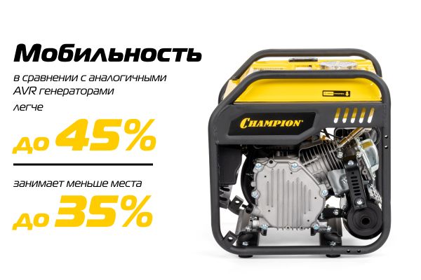 Инверторный генератор Champion отличается повышенной мобильностью и компактностью. Модель на 35–45% легче аналогичных AVR генераторов и занимает до 35% меньше места, что обеспечивает удобство транспортировки и хранения даже при ограниченном пространстве.
