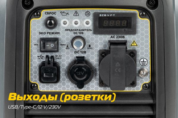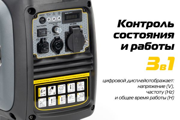 Цифровой дисплей 3в1 отображает на одном экране три ключевых параметра работы генератора: напряжение (V), частоту (Hz) и общее время работы (H). Это позволяет удобно следить за состоянием и режимом работы устройства.