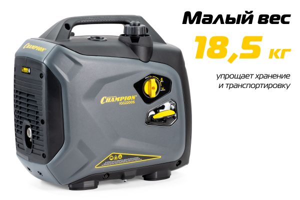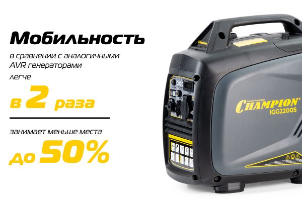Инверторный генератор Champion отличается повышенной мобильностью и компактностью. Модель в два раза легче аналогичных AVR генераторов и занимает до 50% меньше места, что обеспечивает удобство транспортировки и хранения даже при ограниченном пространстве.